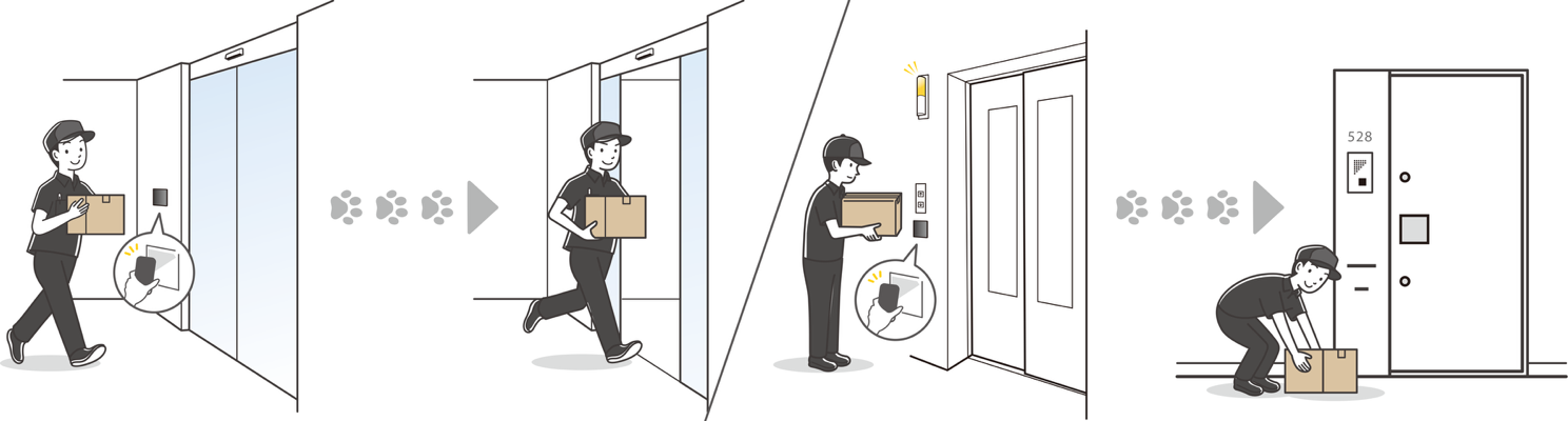 認証が完了すると、建物内に設置された複数のセキュリティゲート(オートロック解錠、エレベータ認証など)に対し、配達員にのみ有効な一時的な解錠権限が付与されます。 -